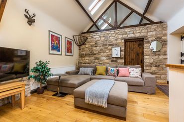 The Stocks Barn has a large open-plan lounge and kitchen with log burner and plenty of comfortable seating for all the family to relax.